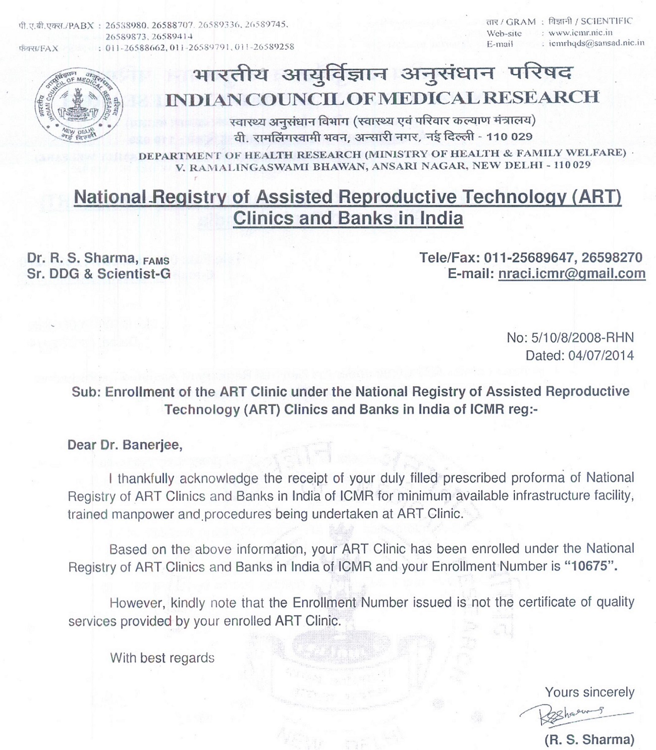 The Indian Council of Medical Research is the Regulatory Authority that governs the rules and regulations for Assisted Reproductive Technology (ART) in India. All ART institutions must adhere to the National Guidelines for Accreditation, Supervision & Regulation of ART Clinics in India, compiled by ICMR.