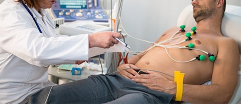 Ten small sticky patches called electrodes are put on your arms, legs and chest. These are connected by wires to an ECG machine which picks up the electrical signals that make your heart beat. This electrical activity is recorded and printed onto paper.
