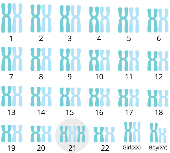 Pair number 21 contains three copies instead of two (Trisomy 21) indicating Down’s syndrome